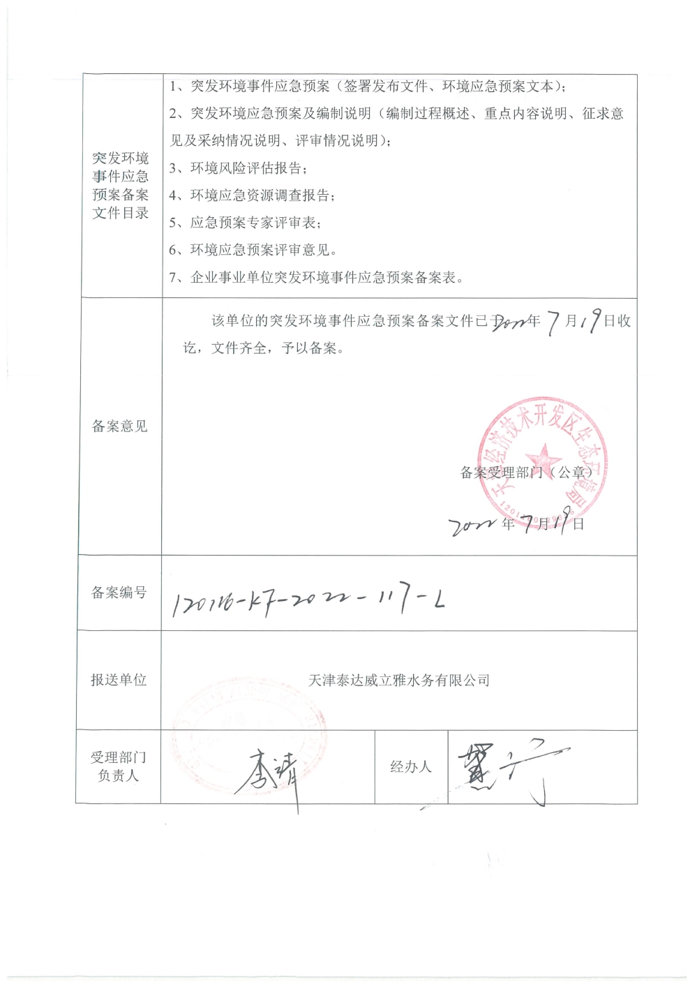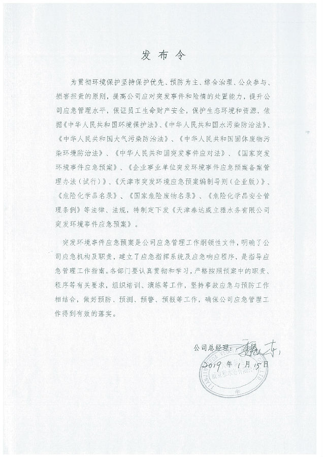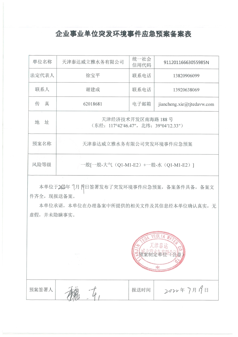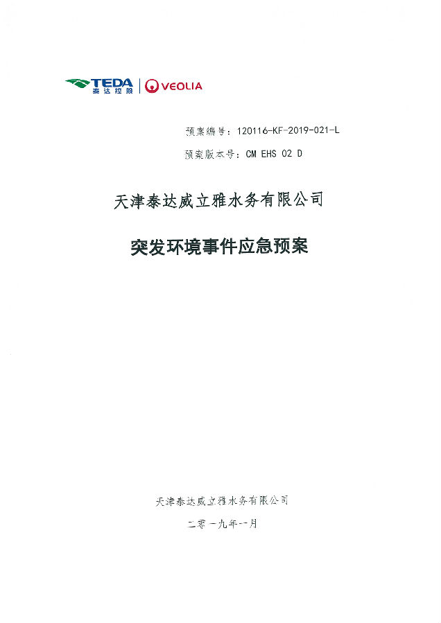 我公司根據(jù)《中華人民共和國(guó)環(huán)境保護(hù)法》以及《天津市突發(fā)事件總體應(yīng)急預(yù)案》等相關(guān)文件要求,于2019年1月編制(修訂)完成了《天津泰達(dá)威立雅水務(wù)有限公司突發(fā)環(huán)境事件應(yīng)急預(yù)案》,于 2022年7月19日完成變更備案并發(fā)布(備案編號(hào):120116-KF-2022-117-L)。